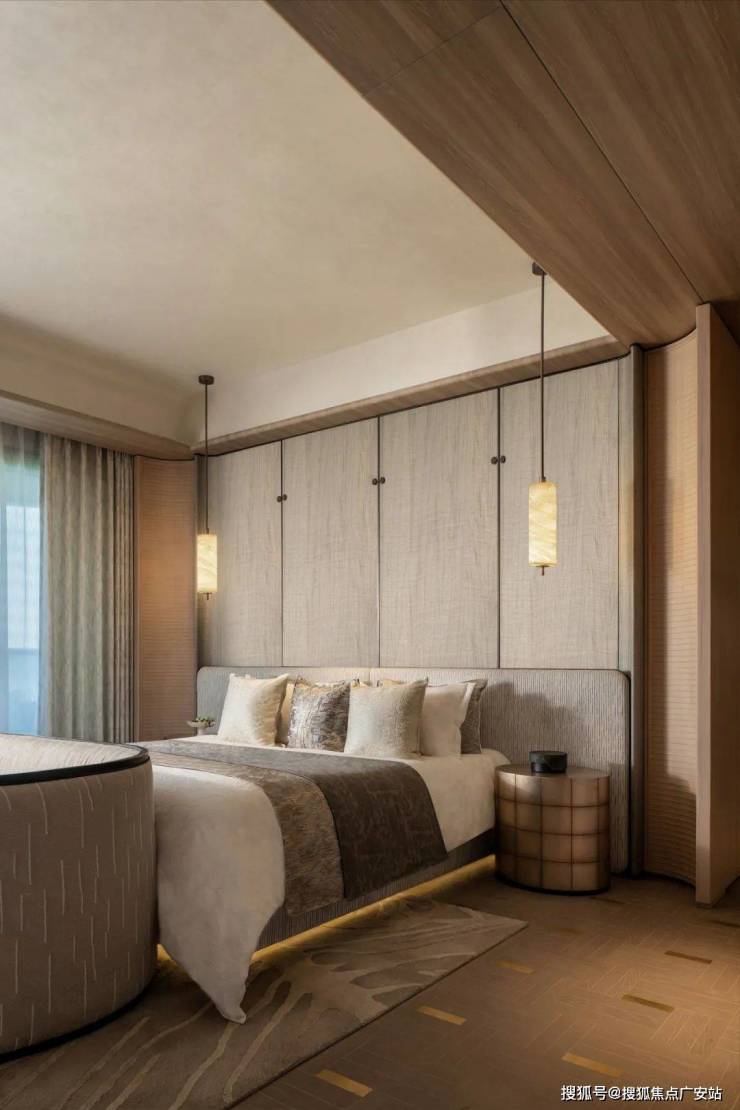 主卧床头曲线纹理自由生长,倒挂的艺术灯像一颗颗种子悬于素色软包之上,艺术品杯盏倏然点破静谧。温馨舒适的私密空间中,享受着难得的闲暇时光,当艺术退为背景,身体方是空间主角。