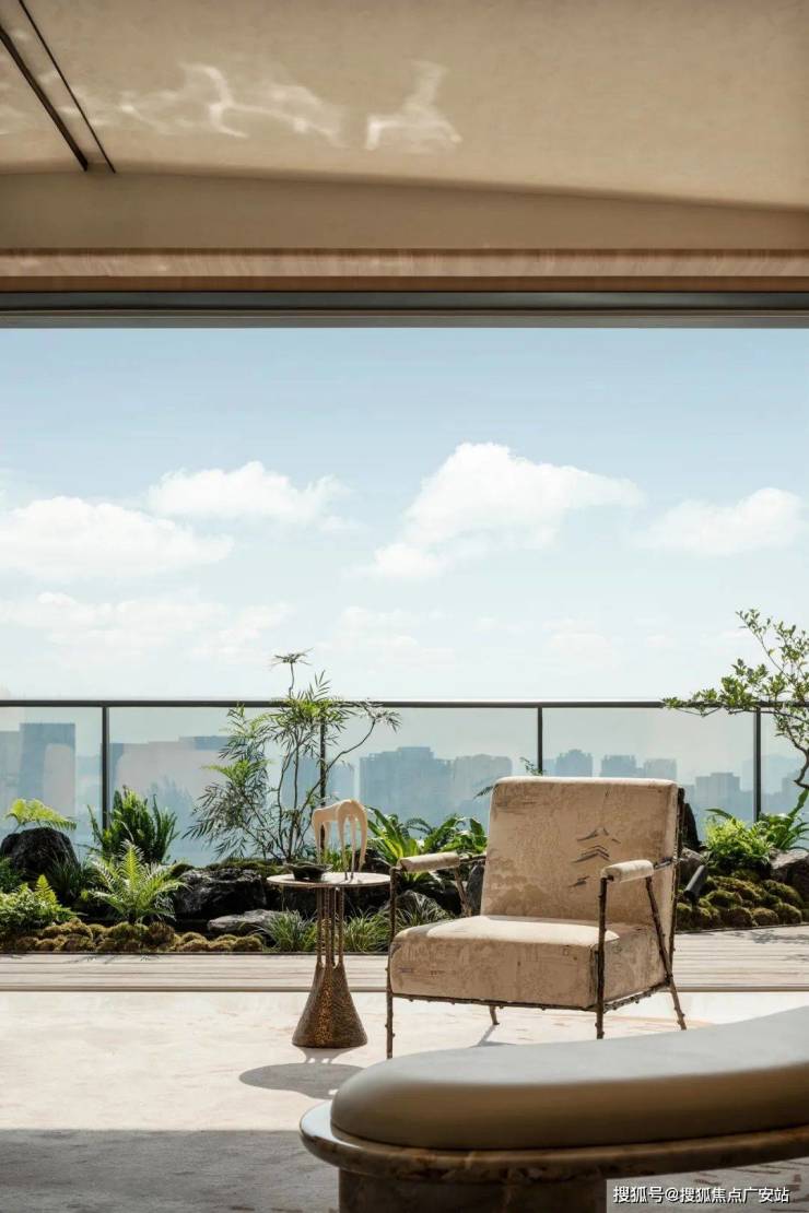 嶙峋的骨架宛如山体,淡雅的印花流动其间,亦刚亦柔完美融合,与后方阳台自然造景相呼应。于此坐拥山水,俯仰间皆是东方雅士的逍遥。