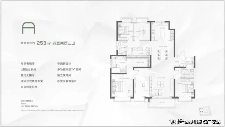 253㎡王者户型:约7.7米横厅开间,L型动线串联四房,约3.3米层高+高区无遮挡江景。