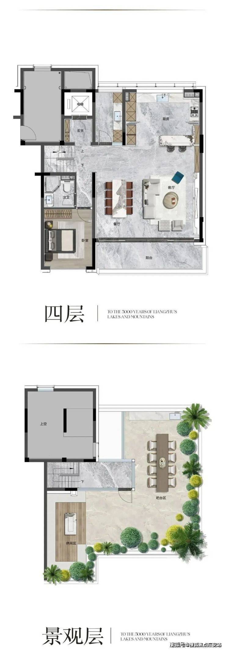 台地高差赋予了建筑更强的层次感,地面花园变成了“露台式花园”,而露台则变成了“空中的私人会所”,连卧室大落地窗都变成了“悬浮于林梢的取景框”,将良渚的自然肌理与人文景致尽收眼底,私密性与视野感双双拉满。
