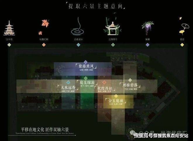 建筑们围合出的中心花园中,州桥老街、秋霞圃、远香湖、古猗园、紫藤园、银杏古树等嘉定6景被南山地产提炼、转译,形成了具有在地文化特色的6大景观主题空间。