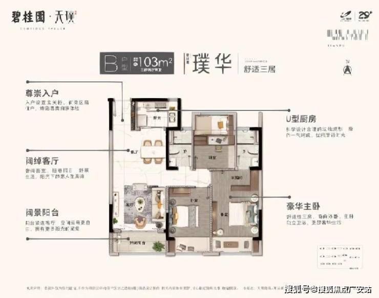 设计强调南北通透、全明户型,并突出顶层和底层的视野与居住品质优势(如观景阳台、低噪音环境);