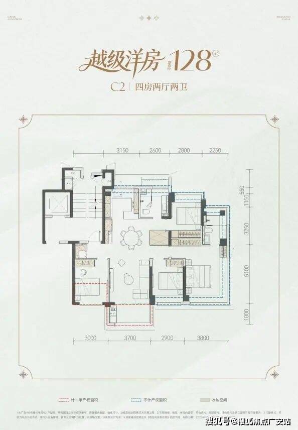 约128㎡「越级洋房」四室两厅两卫,实现了约89-95%的高实得率,将同等面积段产品的空间利用率推至新高度,做到真正的大四卧格局。