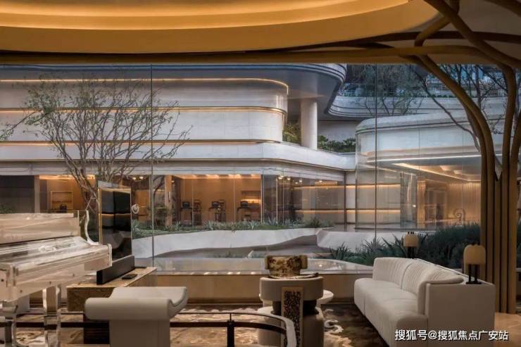 因项目整体抬高,从下沉庭院到架空层“空中花园”的落差极大,形成独特的峡谷地貌,杭序府的设计团队汲取九溪烟树为造园灵感,打造一个立体多维的城市溪谷交互园林;因项目毗邻江岸,杭序府的外立面以“站立的江潮”为灵感,大面积弧形玻璃与四层堆叠的石材线条,将钱塘江潮的千钧之力和流水之韵凝练于建筑肌理之中。