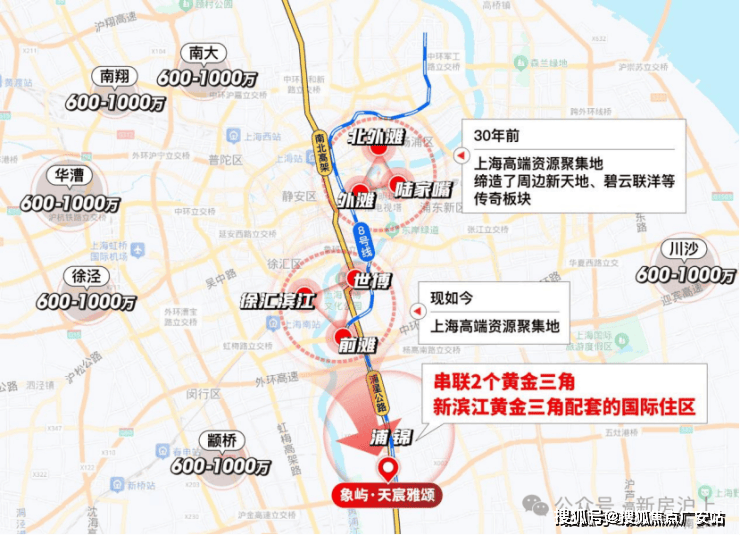 1、8号线+南北高架一路串联2大滨江黄金三角,占位前滩后花园!众所周知,高端城市资源高度集中在2大滨江黄金三角:由外滩-陆家嘴-北外滩构成的传统中央商务区,由前滩-徐汇滨江-世博构成的新兴中央活动区。其他所有板块几乎都是经由它的价值辐射。换言之,谁距离他们更近通勤更快谁就更有未来!全市600-1000万的新房供应板块,几乎都在城市的外围,与2大黄金三角相距甚远,通勤时间也较长。有且只有浦锦板块,通过8号线和南北高架+浦星公路,同时串联2大黄金三角,未来前景不言而喻!