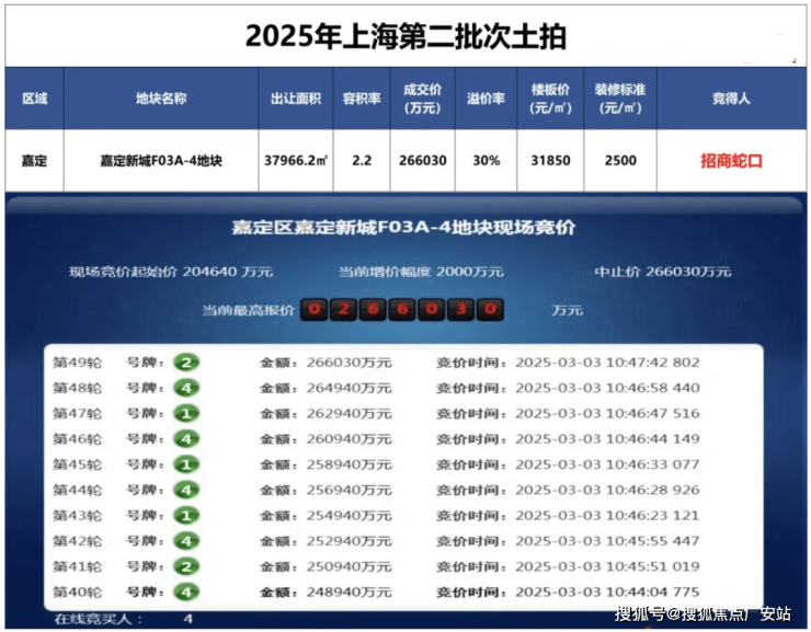 3月3日,上海2025第二批次土拍,经过49轮竞价,招商蛇口以266030万元的总价摘得嘉定新城远香湖F03A-4地块,溢价率30%,成交楼板价约31850元/㎡。上海嘉定招商林屿湖畔售楼处电话:400-9966-224®招商林屿湖畔营销中心热线4009966224(官方预约看房热线)