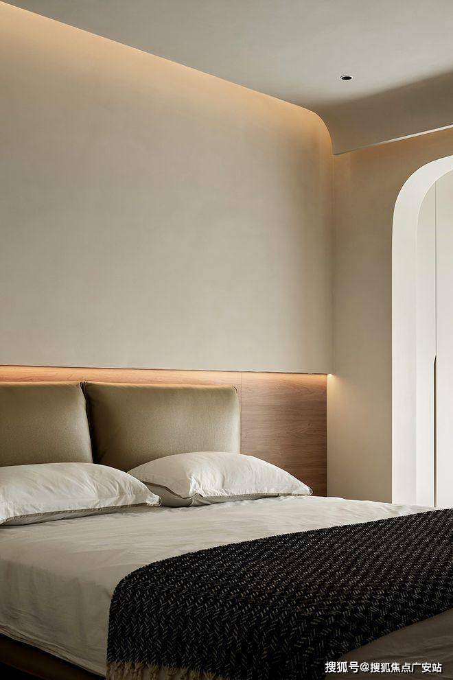 卧室简约且大气,床头背景墙使用板墙木饰面,配合无主灯的暗藏灯带,提升卧室的明亮度和层次感,纵享精神与生活的双重丰盈。