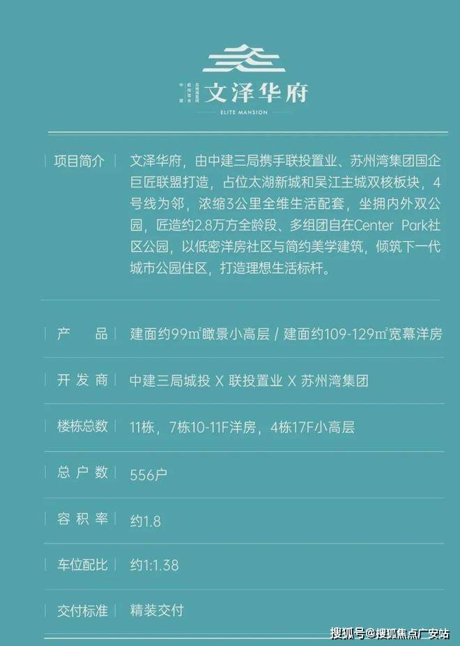 文泽华府是苏州吴江太湖新城东太湖大道与长安路交汇处的中建三局开发项目,包含小高层和洋房产品,主打精装修交付与智慧社区。以下是关键信息汇总: