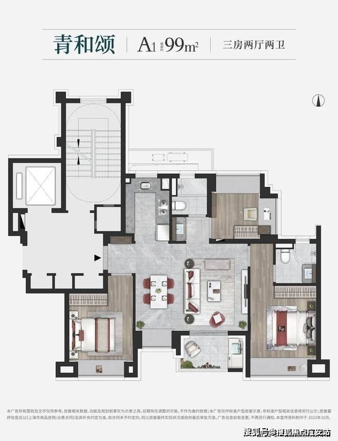 建面约99㎡3房(A1户型),做到了3.5开间朝南设计,整个户型几乎没有浪费面积~实现空间节约、居住升级等美好体验。