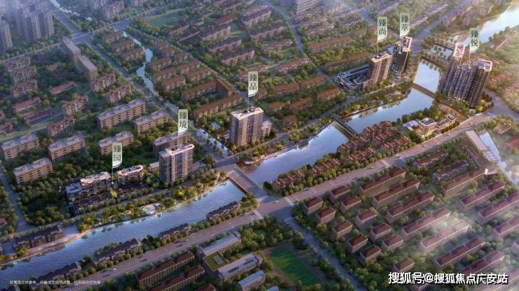 同时,整体建筑布局随河蜿蜒,高低错落的建筑形态也契合了江南水乡的水韵特色,加之建筑顶部的金冠起伏,与景观河交相辉映,串联成金色丝带东西贯通,更是凸显了本项目的高标准、高品质的居住体验。
