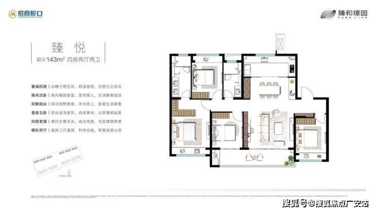 143㎡户型同样四室朝南,14.4米超大面宽,4.75米宽厅衔接7.7米观景阳台,采光优越。