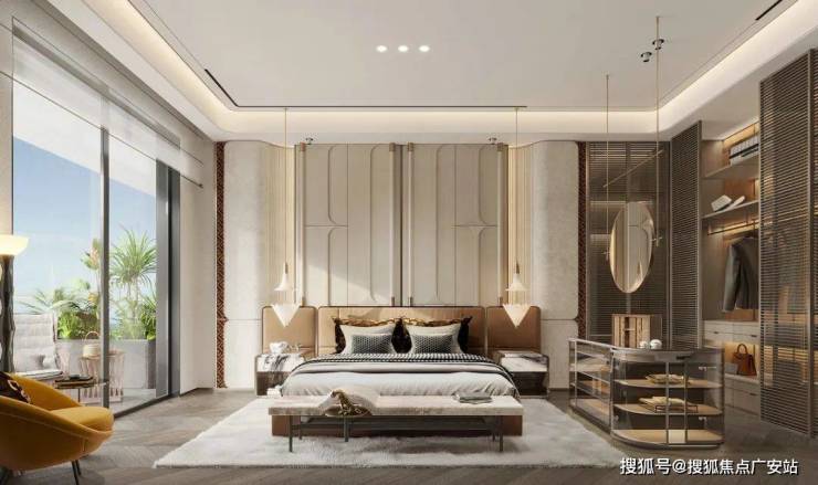 主卧的空间相对较大,背景是利用左侧的窗帘做的对称硬包的处理,其实后面有暗藏的灯带,使层次更为丰富一些,整体的家私和风格的感觉延续客厅,注重品质和空间的感受。