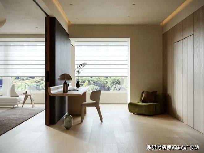拆除卧室原有隔墙,拓宽空间尺度,引光入室勾勒家的轮廓。口袋移门隐于饰面板隔墙内,赋予书房未来独立成卧的灵活可能。温润木质书桌搭配黑色木饰面,划分功能区的同时,增添空间层次感与韵律感。共享区与多功能书房相互呼应,实现 “各享其趣,抬眸可见” 的理想互动场景。