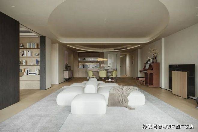 为营造自由通透的空间感,我们规划流畅生活动线。米灰色低饱和模块沙发,以多面体块拼接造型,灵活适配不同视角与布局,成为家庭核心区焦点。它与多功能房、餐厅、水吧等区域形成视觉呼应,构建出 “平行陪伴” 的温馨生活场景。