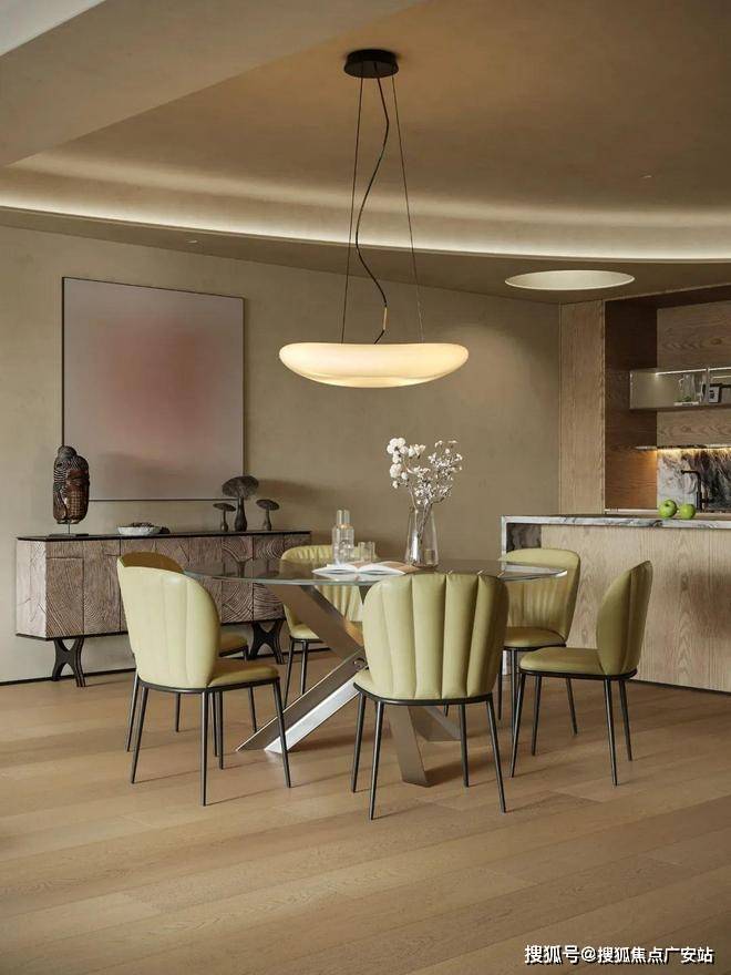 客餐厅以连贯视角奠定视觉基调,顶面弧线替代尖锐线条,贯穿空间削弱压迫感,延伸视觉开阔度。柔和暖色调交织出丰富层次,搭配弯曲线条勾勒轮廓,营造松弛宁静的生活氛围,弧线更成为串联空间的点睛之笔。