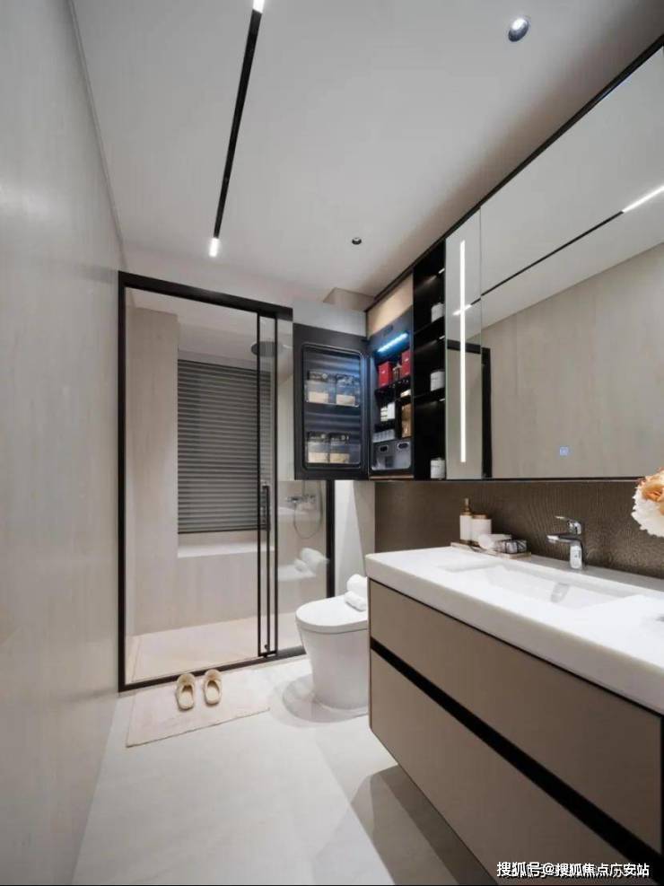 卫浴方面,不仅全部做了三段式分离设计,主卫、次卫均配置杜拉维特智能马桶、汉斯格雅龙头花洒,家使用起来高效便捷。台面使用石材,同时将弧形曲线用到了极致。主卫更是配备了美妆冰箱。