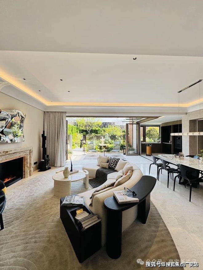 「无界空间」:客厅270度转角无柱设计,搭配落地玻璃,开阔视野将院中风景迎入日常。