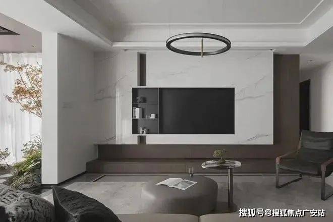 客厅部分以白色深棕为主,在交错间奠定沉稳大气的基调。独特的大理石岩板背景墙,高级感max,搭配低饱和沙发,让空间充满设计与质感。