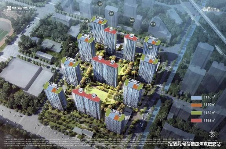 整个项目沿南北中轴对称,地块两侧的8栋楼为2T4的110/132户型,地块中间的4栋为2T2的156户型。
