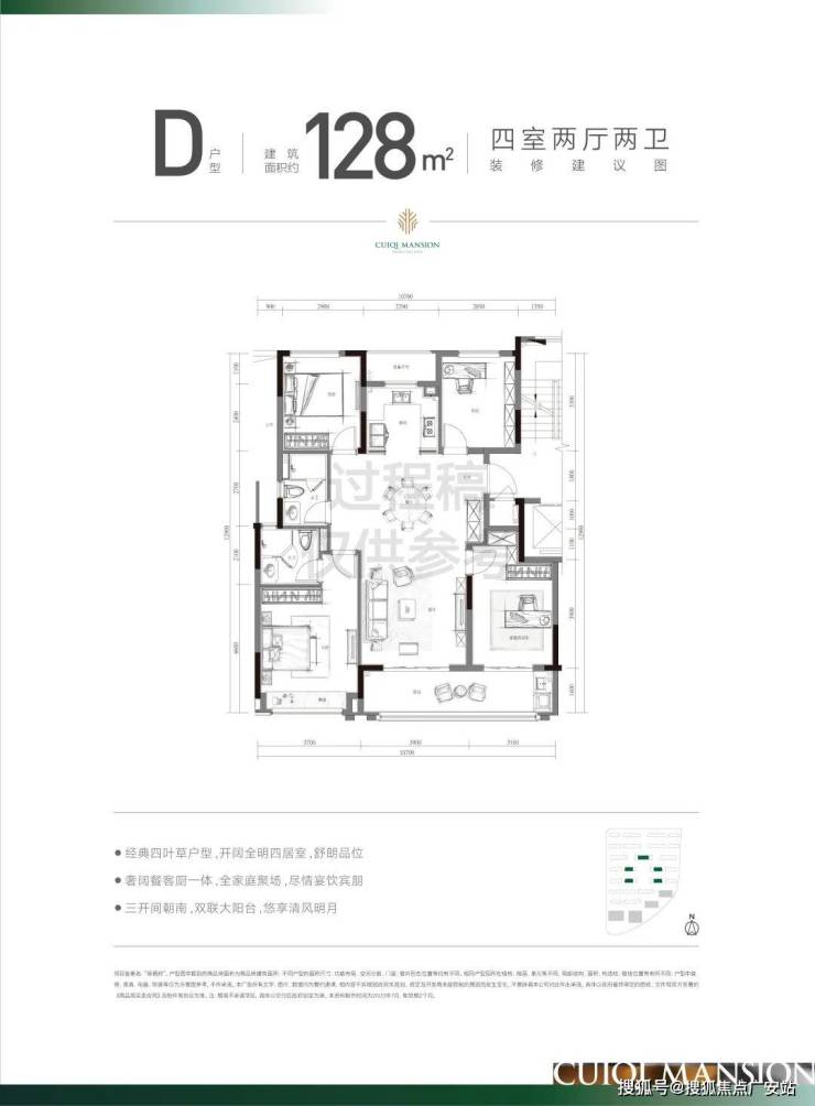 建面约128方采用了深受市场认可的经典的四叶草格局!这种户型的显著特点,就是消灭过道。客厅居于房子的中心,可以直接到达卧室、书房、厨房等各个空间。另外,4个功能间居于四角,对私密性的维护也和当下社会注重隐私的需求不谋而合,即使是孩子、长辈同住,也能有一个很好的家庭秩序。