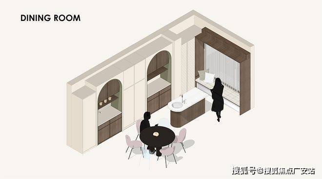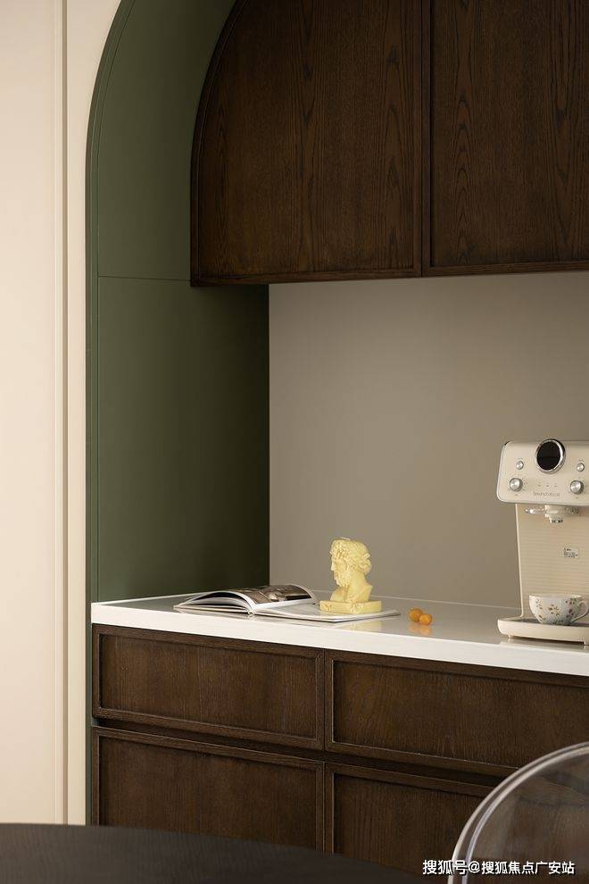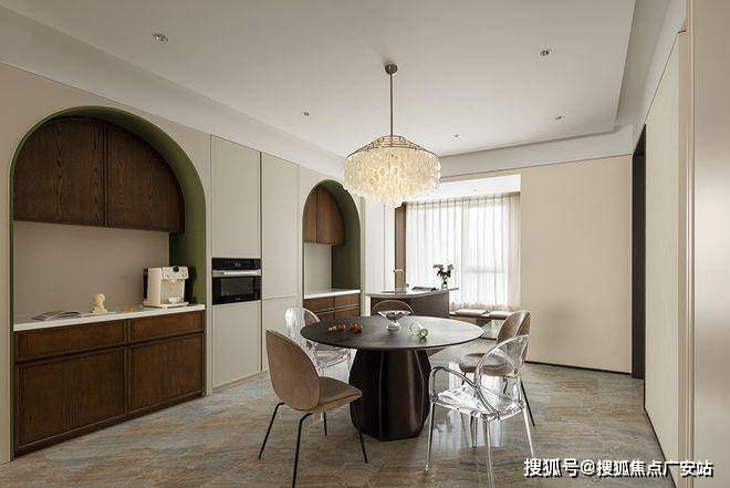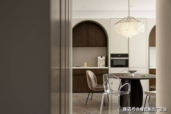 厨餐厅,内置双拱门造型,利用空间穿插、错景,划分餐厅与西厨区,开放互动气质与当代审美相结合,隔而不断,界而未界,留给空间更多的想象和延伸。