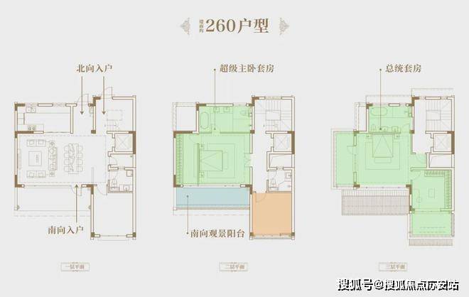 甚至,在保证二、三楼休憩区,保证了和独栋产品东侧(双拼部分户型为西侧)、南侧阳台观景的同时,还增加了北侧观景阳台,实现三面观景的无敌示意。