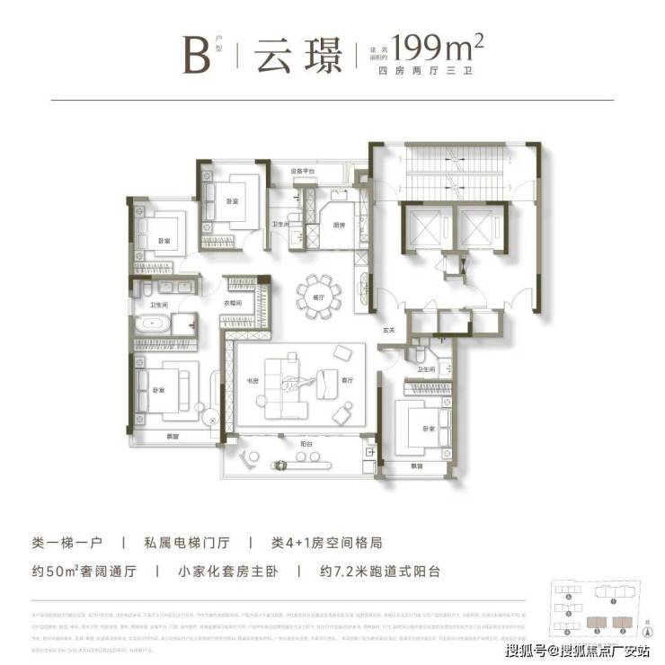高层均为建面约199㎡的大平层户型,极致纯粹的业主圈层,带来更为尊贵的居住体验。其户型设计尽可能扩宽南向开间的同时,展现出了极为阔绰的空间尺度,足以满足多代同堂的居住需求,成为众多购房家庭终极改善的首选。
