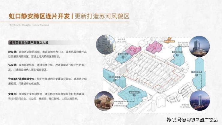 弘安里的北侧的静安里,上海静安里,汲取新天地、张园等城市节点级风貌商业精髓,精心规划沿武进路历史风貌商业街区,展示体验在地文化,打造高端零售、高档餐饮、文化展览等丰富业态的商业格局,再融入弘安里和静安里的成片风貌区,未来这里将成为上海的新里天地!东侧的18街坊,就是崇邦集团商办综合体。总建筑面积达29万㎡,其中包括约11万㎡的新建商业设施,10万㎡的超高层办公楼,目前已投入使用。西侧则是安康苑和龙盛湾上打造的超高层住宅和高能级商业。