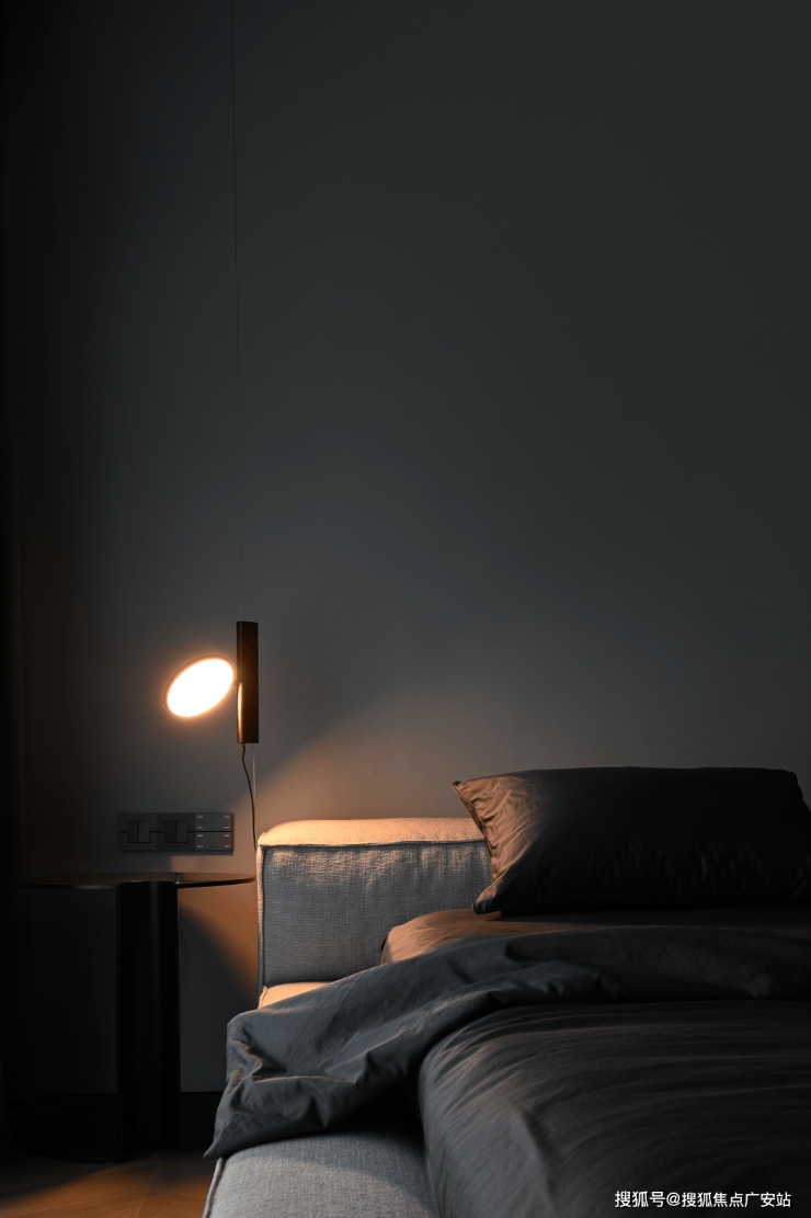 从客厅行至卧室,光线也由明转暗,携手人们渐入佳境。温暖柔和的光线呈点状晕散,柔顺迂回的线条在暗影中浮现,朦胧暧昧的氛围大面积散开,为夜色中的好时光作陪衬。