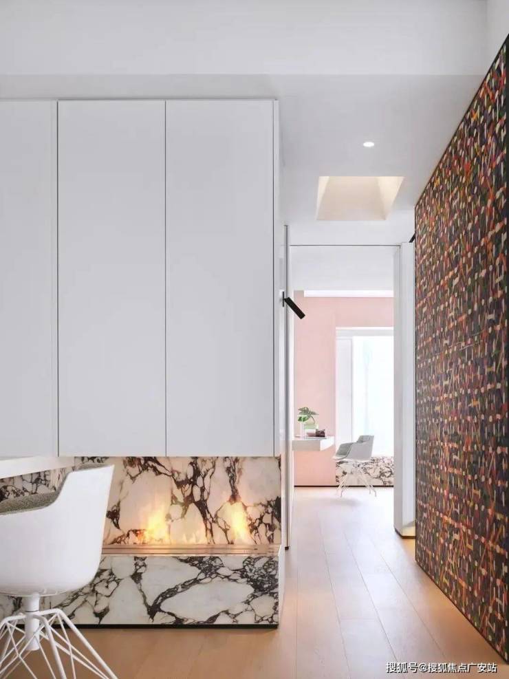 岛台旁做了壁炉的设计,壁炉上方嵌入一组隐形收纳柜,无门把的推弹设计,与墙体齐平,保证了立面整洁连贯的视觉观感。