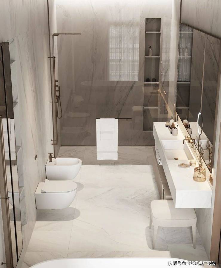 The bathroom expresses the cleanliness of the space through bright light, and the white marble sets off the cleanness and purity of the space, showing a sense of high quality.