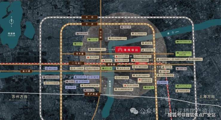 璀璨三轴:与三大昆山动脉娄江、前进路、同丰路璀璨共振交通之脉:享三横三纵路网,与同丰路大桥交汇,坐享城中价值,紧邻地铁11号线(仅约400米)现已开通,便捷换乘通达苏昆沪璀璨之芯:金鹰国际购物中心等都在3公里范围内,举步繁华,尽享多彩生活教育之源:紧邻震川小学,周边仁宝幼儿园、震川高中等多所优质院校环伺,护航菁英成长生活之本:昆山市第一人民医院(友谊院区)、宗仁卿医院、东部医疗机构,守护健康自然之境:北侧约250米即为娄江,附近还有黄浦公园、城市公园、长江公园等健康生态场地