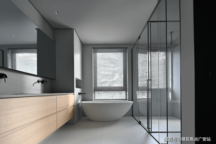 浴室贴心地做了三分离设计,完美践行了极简设计背后暗藏的功能主义。灰色与木色交融,创造出平和舒适的视觉体验。