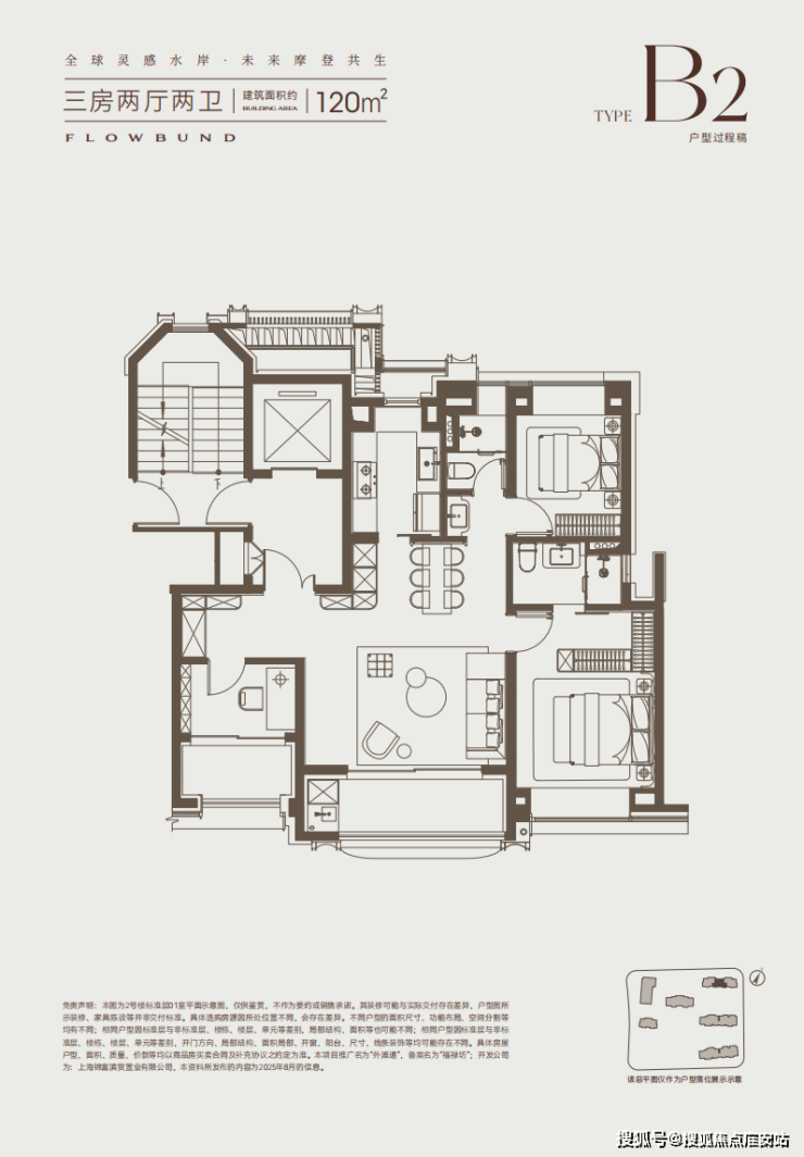 建面约120㎡3房2卫户型