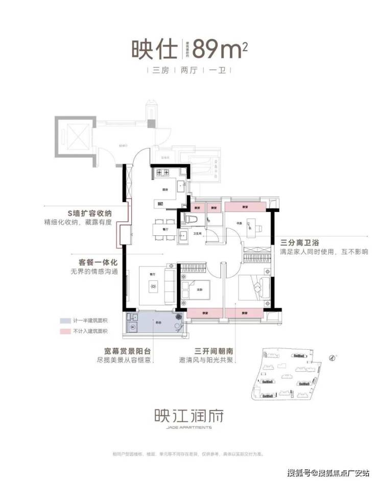 亮点五:双联阳台+多飘窗赠送、灵动空间。映江润府103户型,实现了100平级别难得的双联阳台,实现了室内空间的横向延伸,同时,搭配主卧、主卫、书房的“全飘窗”设计,赋予了空间更多灵动的使用场景。
