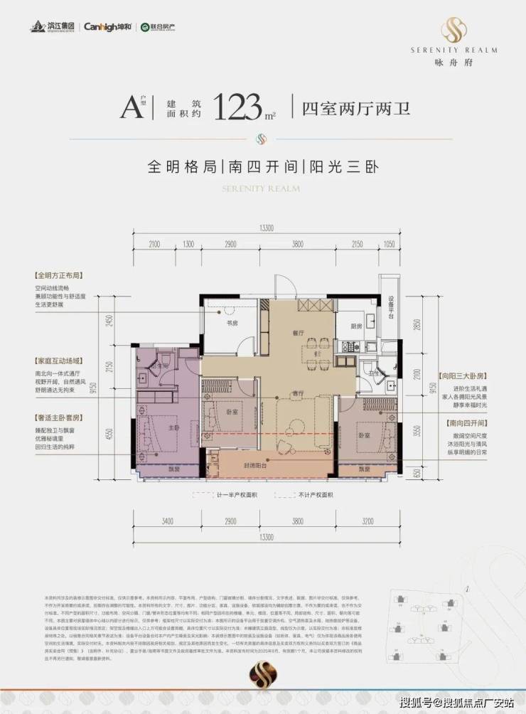 一款是四开间朝南的横厅户型,南向约13.85米的极致采光面,阳台也有约9.8米;动静分区,私密感超强;主卧套房带L型弧形转角飘窗,居住体感堪比全景舱。
