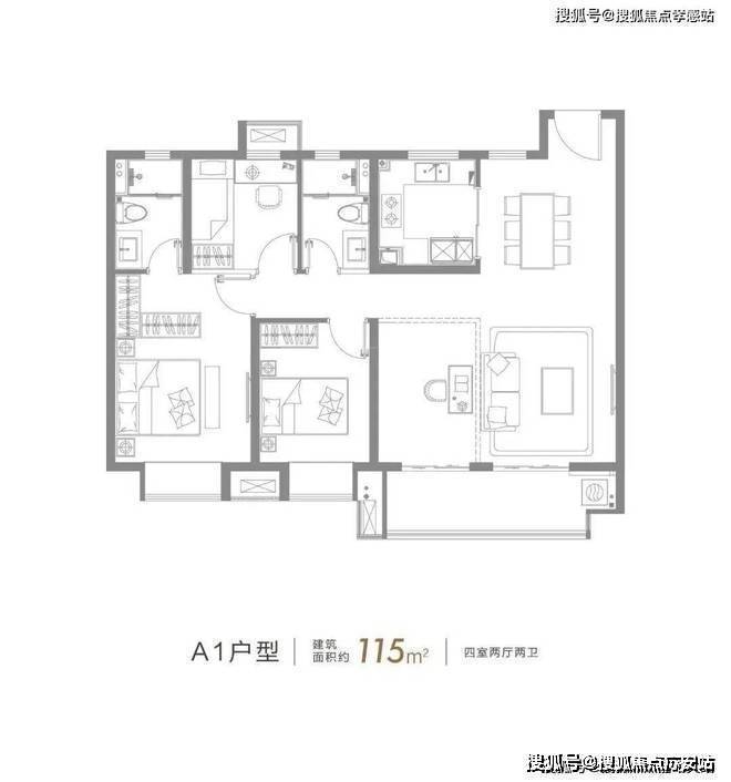 建面约115㎡的4房2厅2卫户型,超大面宽南向阳台、整体南北通透、主卧套房的设计,这个户型实现了多数人对于未来生活的期待。