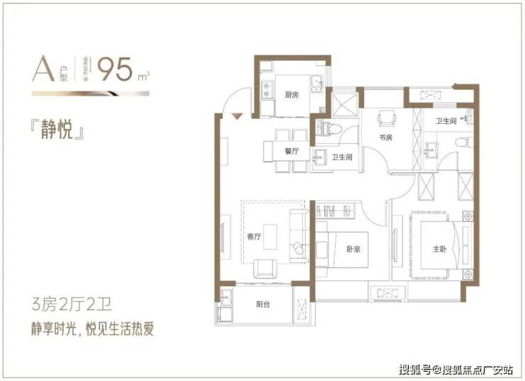 约95㎡3房2厅2卫,南向双卧+客厅全景阳台,空间利用率高,可以满足刚需家庭进阶需求。