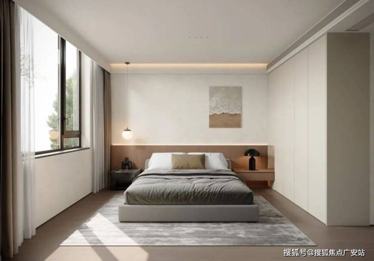 3、主卧一字型床尾柜+刷状台,整合收纳与通道,充分利用主卧进深,同时增强主卧空间的通透感。