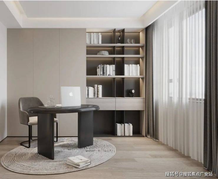 2、客厅采用会客厅+开放式书房布局,书桌放原阳台空间,客厅动线更流畅,有效增加家人互动场景;