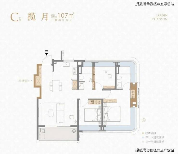 不夸张的讲,这个建面约107㎡刷新了我对百平三房的新认知,据悉该户型或将申请专利,我认为实至名归!