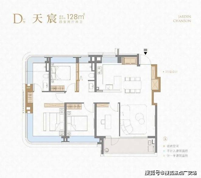 项目建面约128㎡4房户型延续了前作3S墙的设计,保证了收纳空间的丰富性。