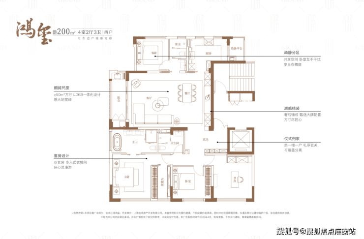 而在江湾鸿玺纯200平户型尺度下,舒适度完全拉满。双套房+次卧+书房设计,近50平方厅布局,给三代同堂的家庭生活真正的体面。动区、静区互补干扰,主卧与次卧,皆有私属独卫空间,再没有百平三房的逼仄。