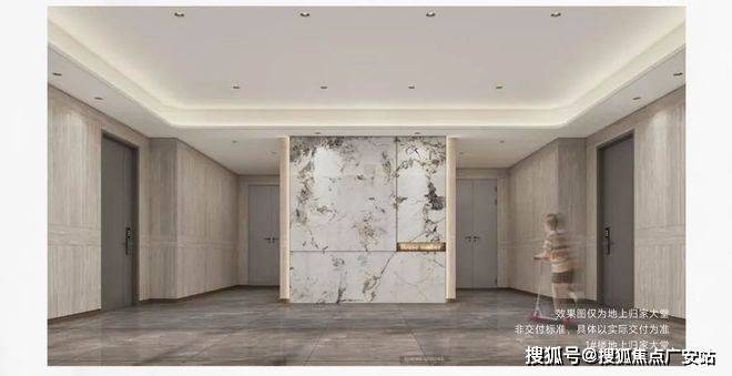注重归家的仪式感,更重视心灵的归藏,奢装地上入户大堂,公区墙面地面均采用仿石材墙砖,大堂主背景采用仿石材岩板,搭配古铜色不锈钢踢脚线收口线,营造尊崇的入户体验,彰显奢宅生活主张。
