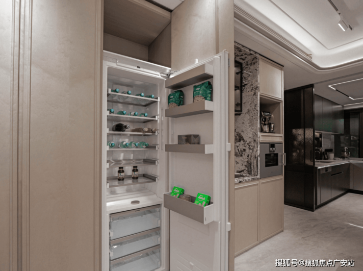 来到客厅,收纳空间更是拉满。次净衣区、餐边柜全部是交付标准,大面积影木的使用,加上装饰主义细节,质感出众: