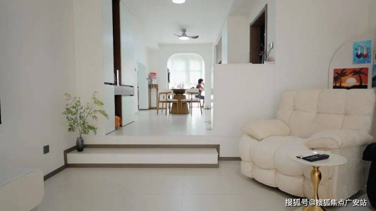 2、客厅与餐厅之间以台阶连接:用最原始的“高差”手段,以零占地的垂直维度实现分区,保留90%以上的视觉通透性。