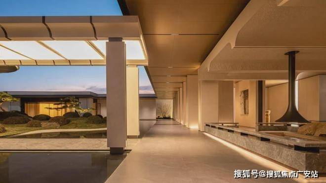 沐云川这次的追随步伐近到邻国日本,远到欧美。像从京都足立美术馆借鉴到,并最终内化成有着庭园风光般恬静的归家序厅;还有就是沿着“大水院”的下沉式行政酒廊;再到室内精装延伸出的侘寂风。