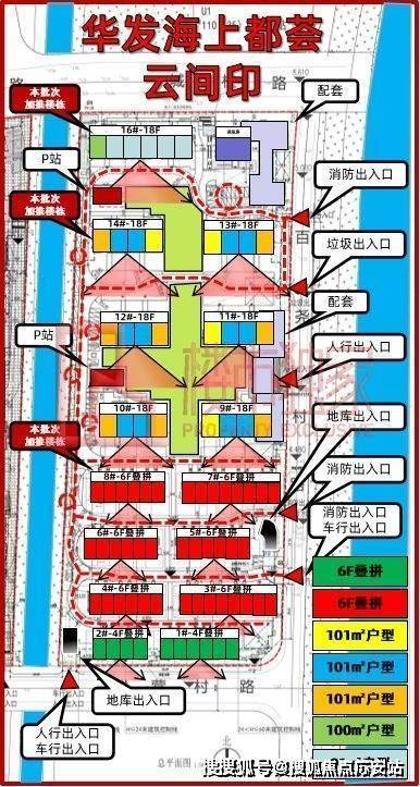 交通流线:小区车行出入口以及人行出入口均位于地块南侧与东侧,机动车进入小区可直接下地库。需要注意的是,小区地面存在停车位(已用红圈标出),如要实现人车分流需通过管理手段。同时,在选房时要注意这些出入口所带来的噪声影响。(本批次楼栋基本不受噪声影响)社区配套:社区配套用房主要集中在地块东北角、东侧人行出入口处以及高层楼栋之间,其中,特别需要注意的不利配套是P站,暗红色块已在图上标出,选房时请注意!