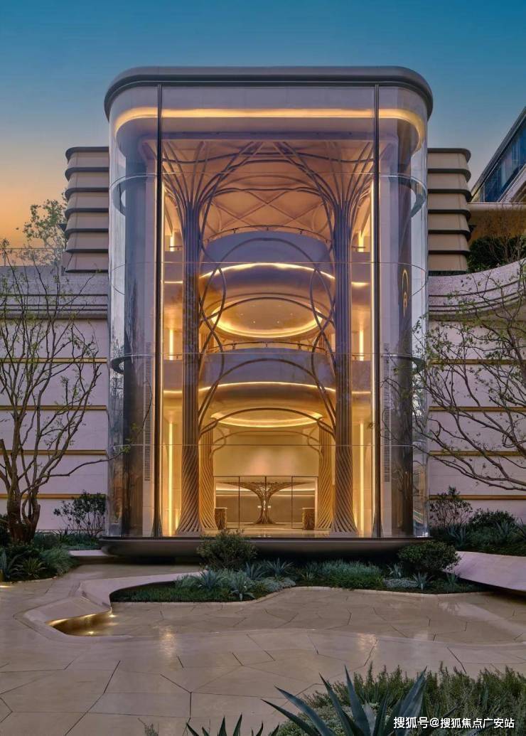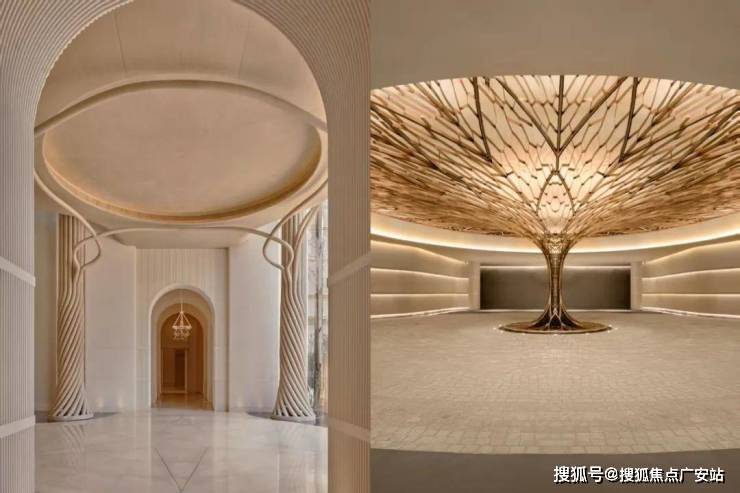 【生辉之金】:香槟金金属流线、手工密拼弧形金属板,外立面石材铝板采用干挂工艺,流动恒久的华贵。