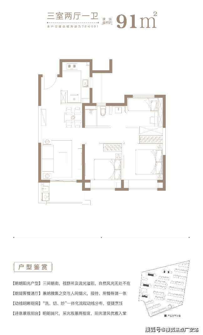 建面约91㎡三房两厅两卫,三开间朝南+双朝南卧室带飘窗+动静分离+卫生间干湿分离,这样的三房设计,对于上海首套置业购房者来说,非常友好,未来想要做置换,也比较容易出手。